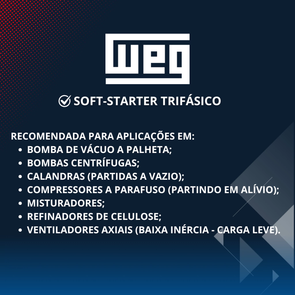 Soft-Starter WEG são chaves de partida estática, destinadas à aceleração, desaceleração e proteção de motores de indução trifásicos. O controle da tensão aplicada ao motor, mediante o ajuste do ângulo de disparo dos tiristores, permite obter partidas e paradas suaves.