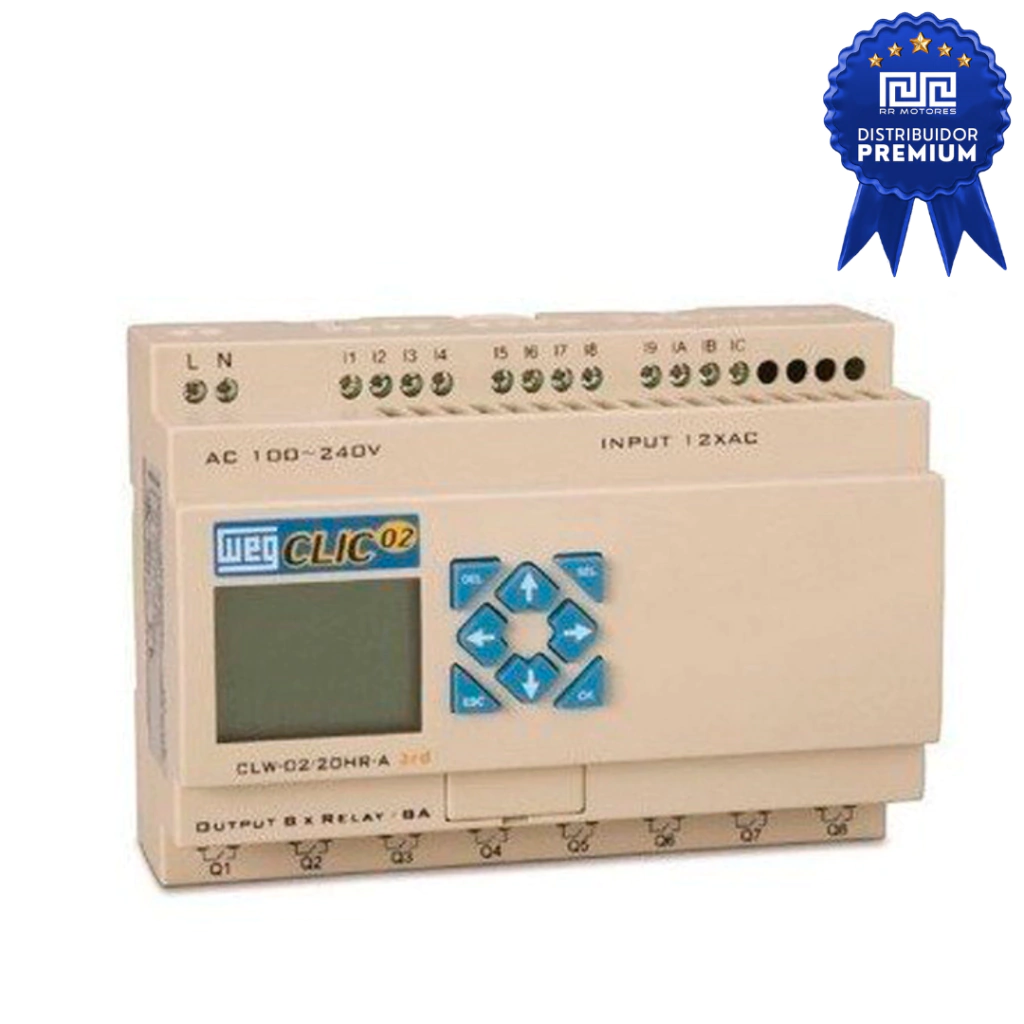 Controlador Logico Weg. Equipamento digital com hardware e software compatveis para a industria. Possui 12 entradas digitais e 8 sadas reles, sua configuracao maxima de 44 pontos de E/S utilizando expansoes, relogio em tempo real, visualizacao de mensagens e alteracao de parametros on-line, alem de um excelente custo benefcio.